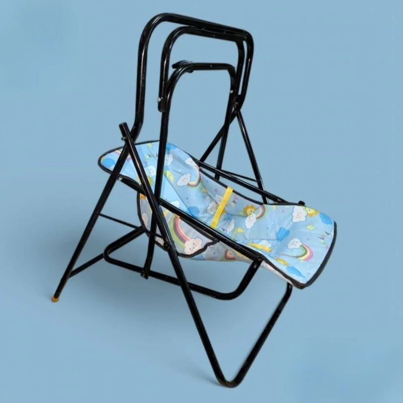 سرير هزاز للأطفال بتصميم عملي وقابل للطي. الهيكل مصنوع من المعدن الأسود القوي والمتين، ويأتي على شكل حامل مرتفع يسمح بوضع السرير في وضعية آمنة ومريحة للطفل. السرير نفسه مصنوع من قماش أزرق فاتح مزين برسومات لطيفة للسحب وقوس قزح، مما يعطي مظهرًا هادئًا ومبهجًا. يحتوي على أحزمة أمان باللون الأصفر لضمان سلامة الطفل. التصميم القابل للطي يجعله سهل التخزين والنقل، مما يجعله مثاليًا للاستخدام في المنزل أو عند السفر.