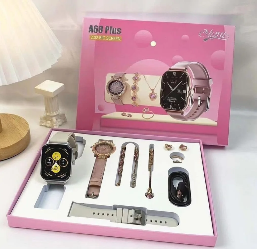 اسم المنتج: طقم A68 Plus – ساعة ذكية بشاشة كبيرة مع إكسسوارات نسائية فاخرة